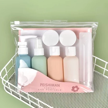 - Structure: The set includes multiple bottles of various types (e.g., pump, spray, screw-cap), along with jars, all organized within a clear plastic bag.